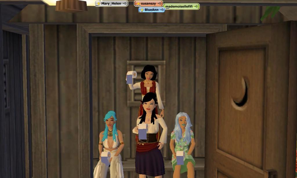PHOTO TASK #5 – The Aurora Highway Rest Stop bathrooms have been rated 5 stars by the Thereian Transportation Agency for the past decade. Aurora caravans and travelers can count on the rest area being clean and well stocked with the “good kind” of toilet paper. The Aurora Parks and Rec Department have been able to maintain bathroom supplies for the busy rest stop location despite mass hysteria toilet paper shortages reported on the Islands of Caldera, Kansas and Nada. This last photo challenge requires your crew to steal all of the toilet paper out of the rest stop bathrooms. Yes, you get a roll of TP and you get a roll of TP and YOU get a roll of TP! EVERYBODY GETS A ROLL OF TP! To commemorate your crew’s shenanigans, cram as many of your friends as you can into the two outhouses at the Aurora Highway Caravan Events Lot. Hold your roll of stolen toilet paper (use the Try It option) and snap a picture of the crew throwing up a ‘HOLE emote sign. Made you look! ‘rofl