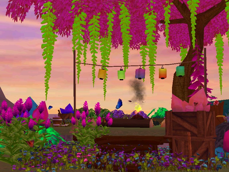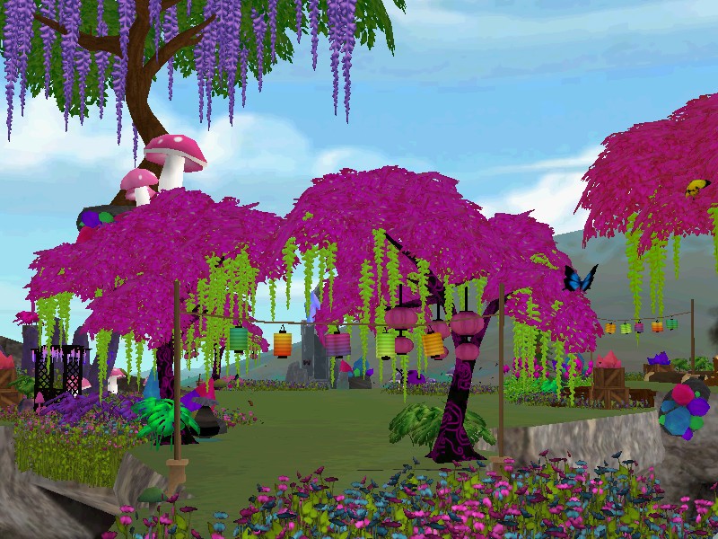 In the mesmerizing virtual world of There.com, an extraordinary sanctuary floats high above the dark and mysterious valley of Tabu. This awe-inspiring realm, known as the Butterfly Sky Garden is a breathtaking, mystical haven planted by the visionary HoodAvie within the Mahalo Fantasy Forest. Suspended on a grand floating rock, this garden is an escape into a realm of neon wonder, lush flora and enchanting butterflies.