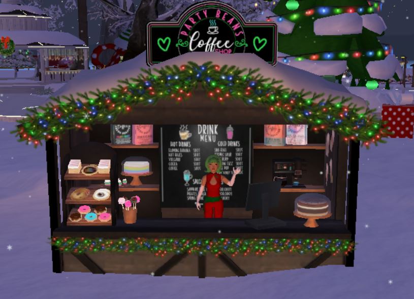 Our first stop on the Holly Jolly Lane tour is Party Bean’s Winter Coffee Shop. It’s a great place to fuel up on coffee, hot chocolate and sweet treats. Party Bean’s offers outdoor seating for fireside chats with friends. On Monday nights you can play BINGO hosted by Susanszy. Earn 1,000 Tbux for every round of BINGO you win plus other fun prizes like props and decorations. The weekly event starts at 6:00 pm Pacific/9:00 pm Eastern. To play, join the BINGO Maniacs club and click on the BINGO card link.