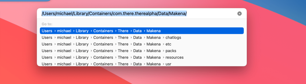 /Users/username/Library/Containers/com.there.therealpha/Data/Makena
