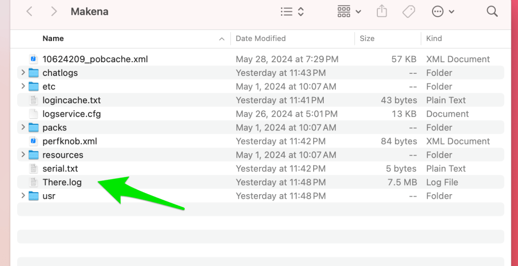 The Makena folder has “There.log” in it along with a folder for your chat logs. Make sure to attach the There.log to your email.